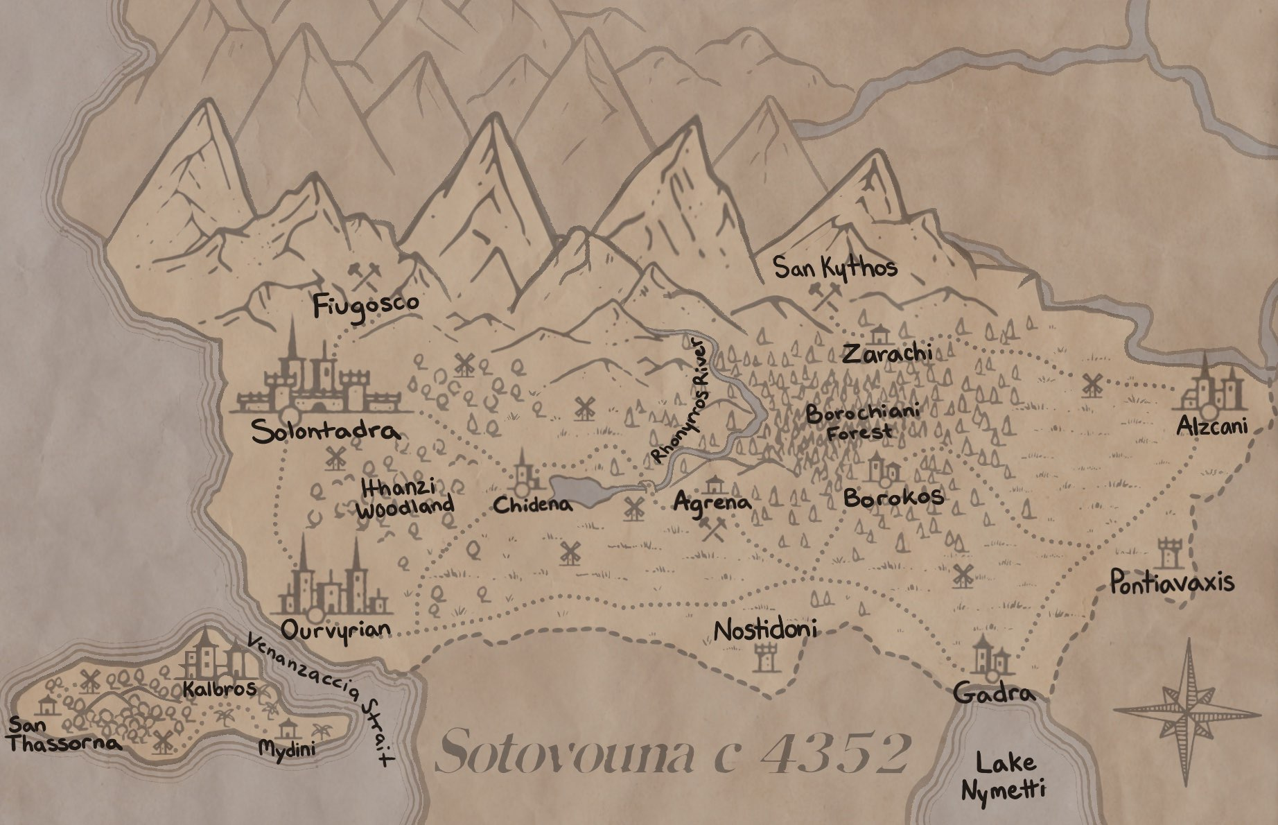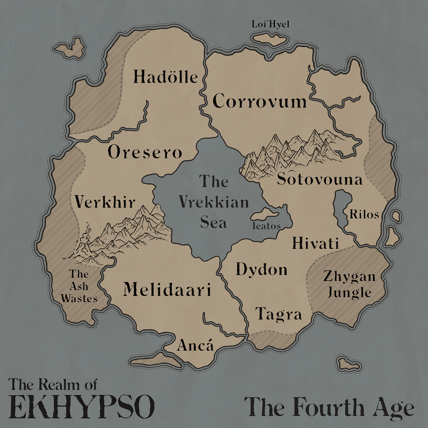 With Ekhypso, I’ve named all of the countries, but haven’t drawn many more specific maps. Aside from one project that I started that was set entirely in Sotovouna. Just one country. I said, “Alright, that’s doable!”