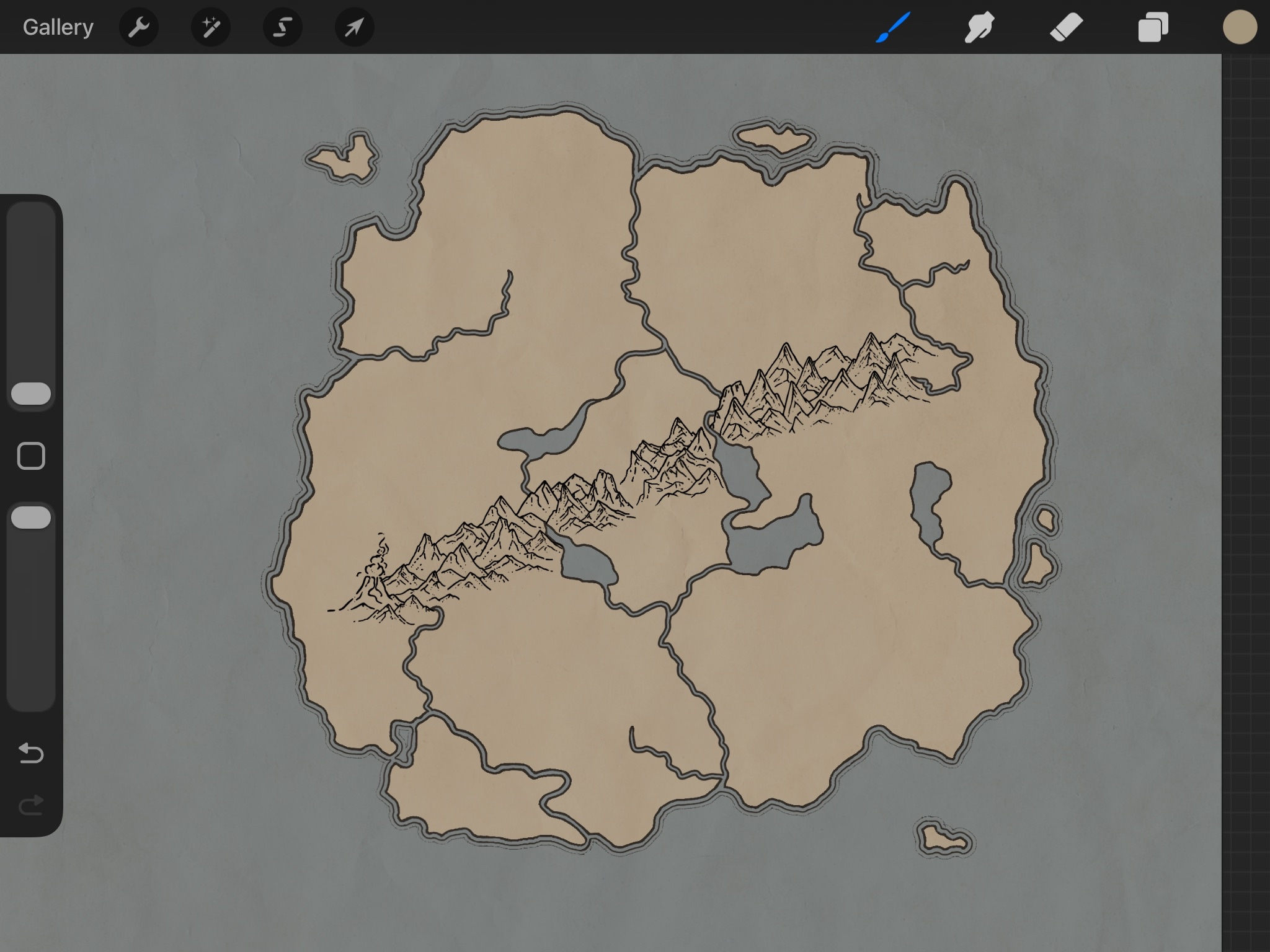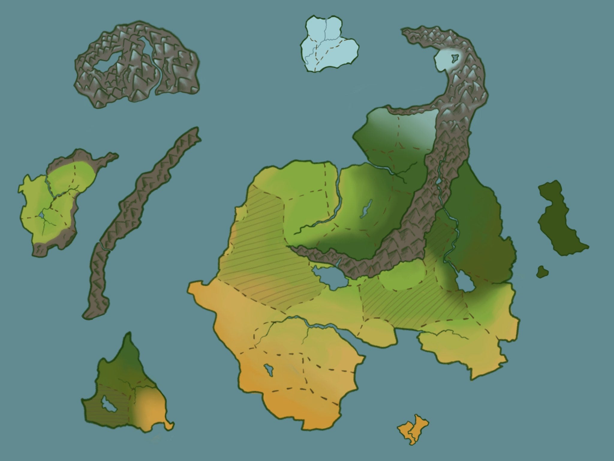 By now you should have the outline of a map and an idea of what the land looks like. So… what next? Well, you have to chop up that land into nice little sections! At this point, you can ask yourself what you want the scope of your world to be. If it’s a sprawling realm of many continents and kingdoms, you have a lot to work with. Maybe you want there to only be a few kingdoms that you can then focus on more completely, and thus they appear larger.