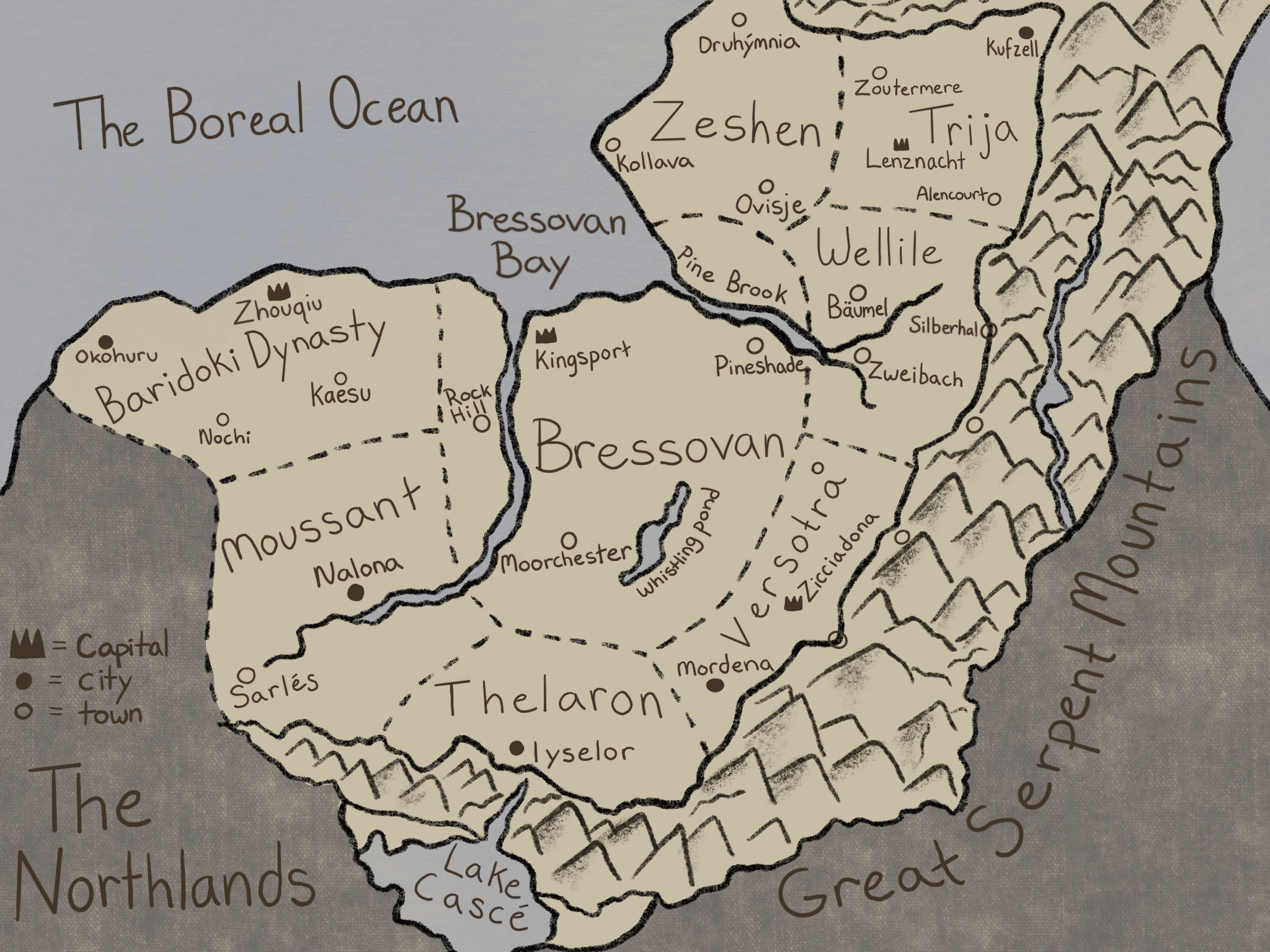 Such a large transformation evoked further questions. For how long was the lost kingdom remembered? When and why did that change? How did that alter the way the other kingdoms interacted with each other? With the kingdom gone, the map looked like a lovely little donut. This inspired my decision that the inhabitants referred to their post-Breaking continent as ‘the Wheel’.