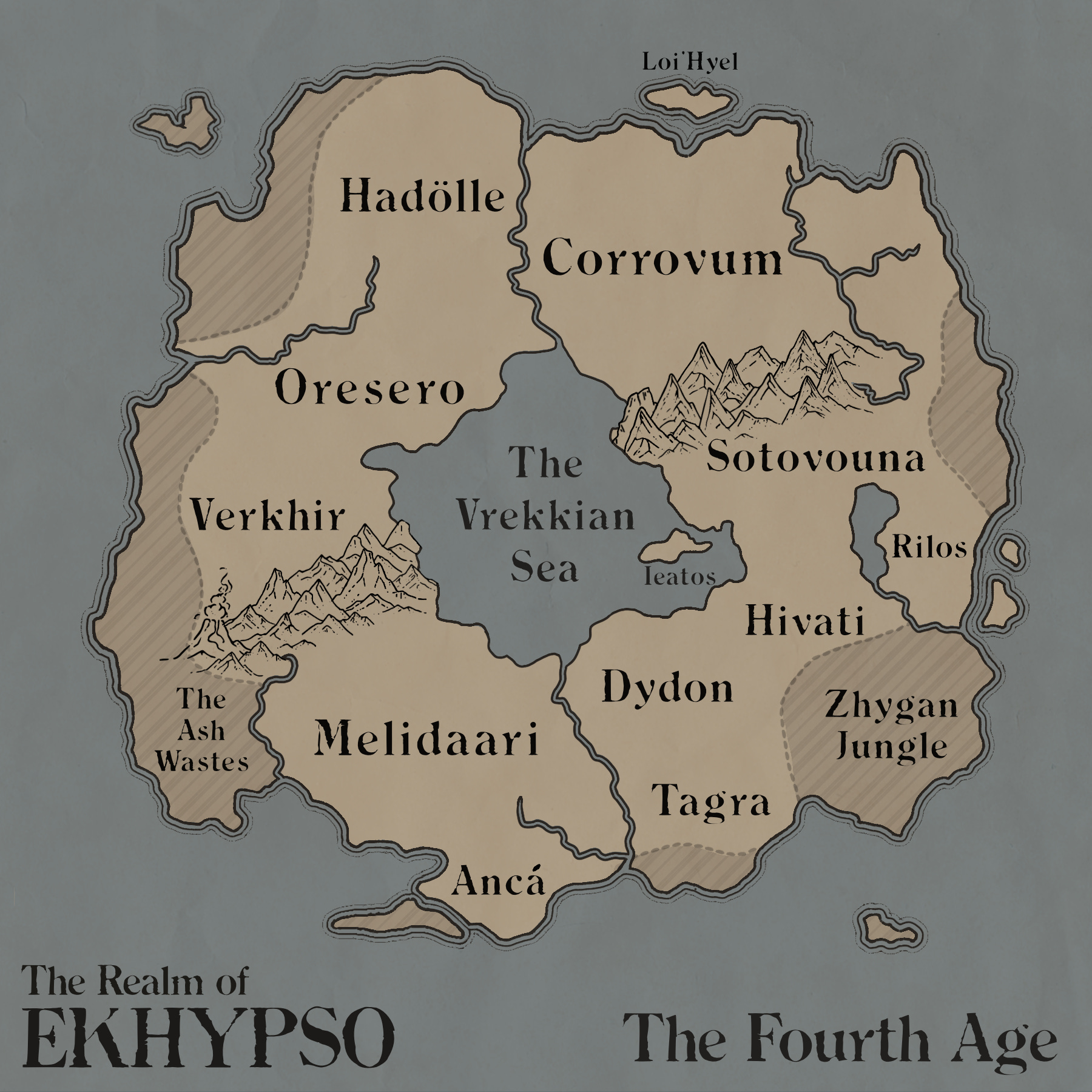 For Ekhypso I landed somewhere in the middle. I didn’t want something massive, but I also didn’t want just a kingdom or two. As I created the timeline I decided that there originally are only a few kingdoms that form during the first age. Over time, they fracture off here and there into independent countries. The map reflects the changing realm. It also gives each of the ages their own specific focus, or flavor.