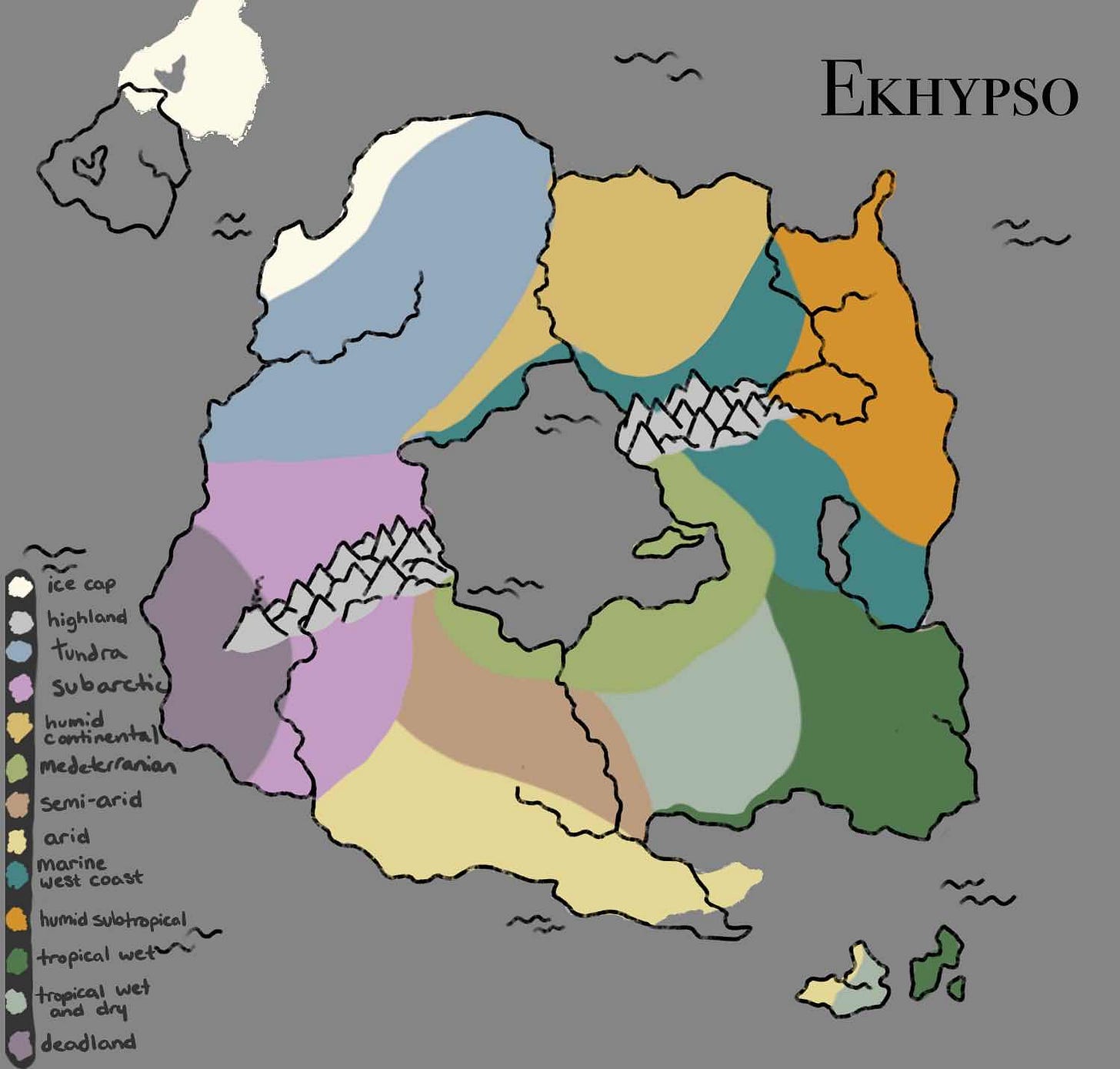 Whether the impetus of a new map was story or setting, the next factor I like to consider is environments. Think climate, terrain, and even solar system. This is definitely a point where your focus here can be as brief or in-depth as you want it to be. For some stories, the answer of ‘why is there a forrest here’ will be ‘because its my fantasy realm and I said so’. And that is just as valid as the method I followed while making Ekhypso (read: adhd riddled deep dive into climate zones that I obsessed over yet now only remember the vibes of).